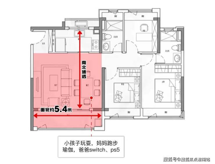 再看102㎡户型,客厅采用约5.4米横厅设计,这个数据非常厉害。