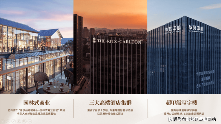 苏州华贸中心择址苏州姑苏区核芯,约78万方地铁上盖城市综合体,规划超甲级写字楼、精品购物中心、园林式商业街区、丽思卡尔顿酒店、万豪行政公寓、雅诗阁服务公寓、华贸姑苏里服务公寓、H+美术馆、紫芝园等多元业态,充分融合东方历史文化与大都市商业文明的精髓,致力于打造全新的江南大都会生活方式。
