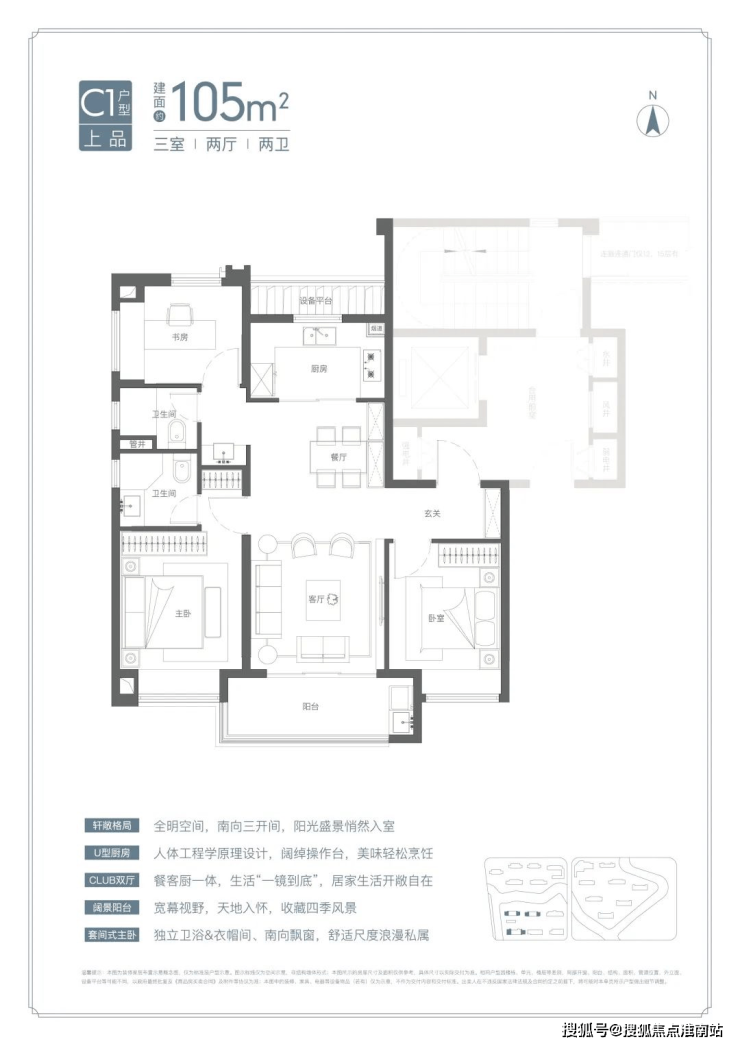U型厨房、餐厅、客厅、阳台一线联通,南北通透。主卧套房、全卧飘窗、次卫干湿分离也都是标配。