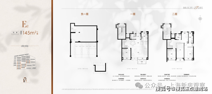 195㎡滨水联排:地上三层 + 地下两层,6米挑高餐客厅 + 双套房设计,前庭后院环绕,地下室可改造为影音厅、藏品室等,总价区间1367–1582万元