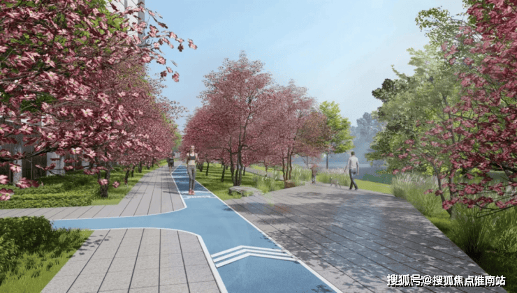 社区北面还特别打造了滨水公园景观大道、樱花休闲步道、600米的健康跑道以及滨水观景平台,让生活回归本真,美好生活从步入社区那一刻开始。