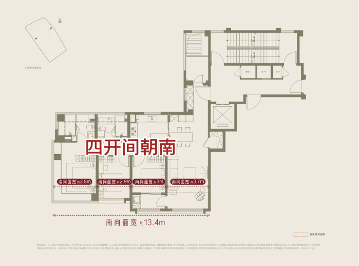 正常120㎡户型南向面宽在 9-10m,125㎡做到13.4m,属于直接“越级”。