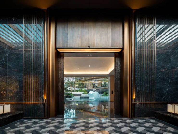 主入口知·云栖,取意西湖十景以"洄游"为理念,超52米跨度的回字形布局,重构传统"四水归堂"空间序列,由奢石、华盖、汉白玉雕塑,以及景墙、紫薇树等组成,尽显气派。约2.4米“流光礼宾” 塔冠,如悬浮的美学灯塔,与金色挑檐相映成辉,全封闭式阳台勾勒建筑轮廓,让立面如镜幕般收纳约30公里江岸鎏光。