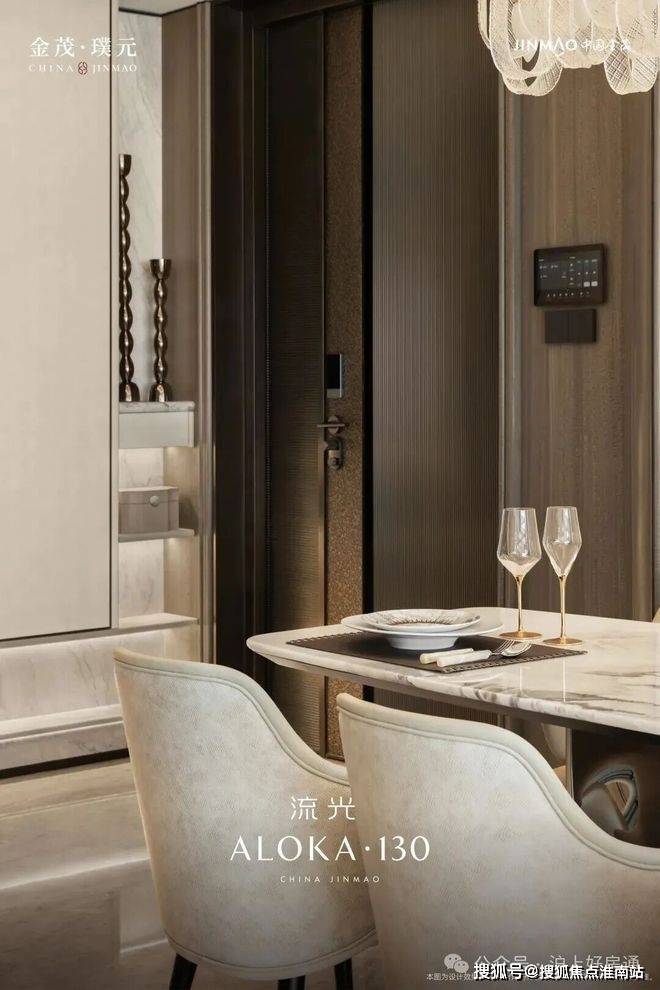 餐厅区域打造了整面墙的餐边柜(交付标准),✅✅金茂璞元售楼处电话:400-891-9910✅✅中间是弧形的芬迪白奢石背景墙,工艺复杂,视觉效果非常震撼