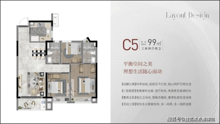 建面约99㎡3房2厅2卫,做到了三开间朝南+动静分离+南北通透+双卧室朝南+主卧套房设计+明厨明卫,室内通透明亮。