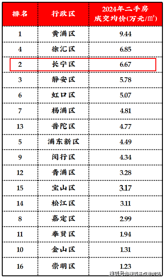 2024年长宁区二手成交均价(约6.67w)超过了静安(约5.78W), 仅次于黄浦徐汇全市第三。