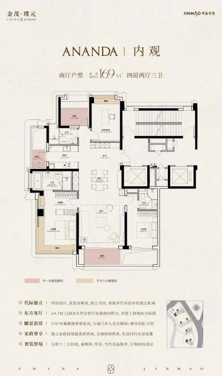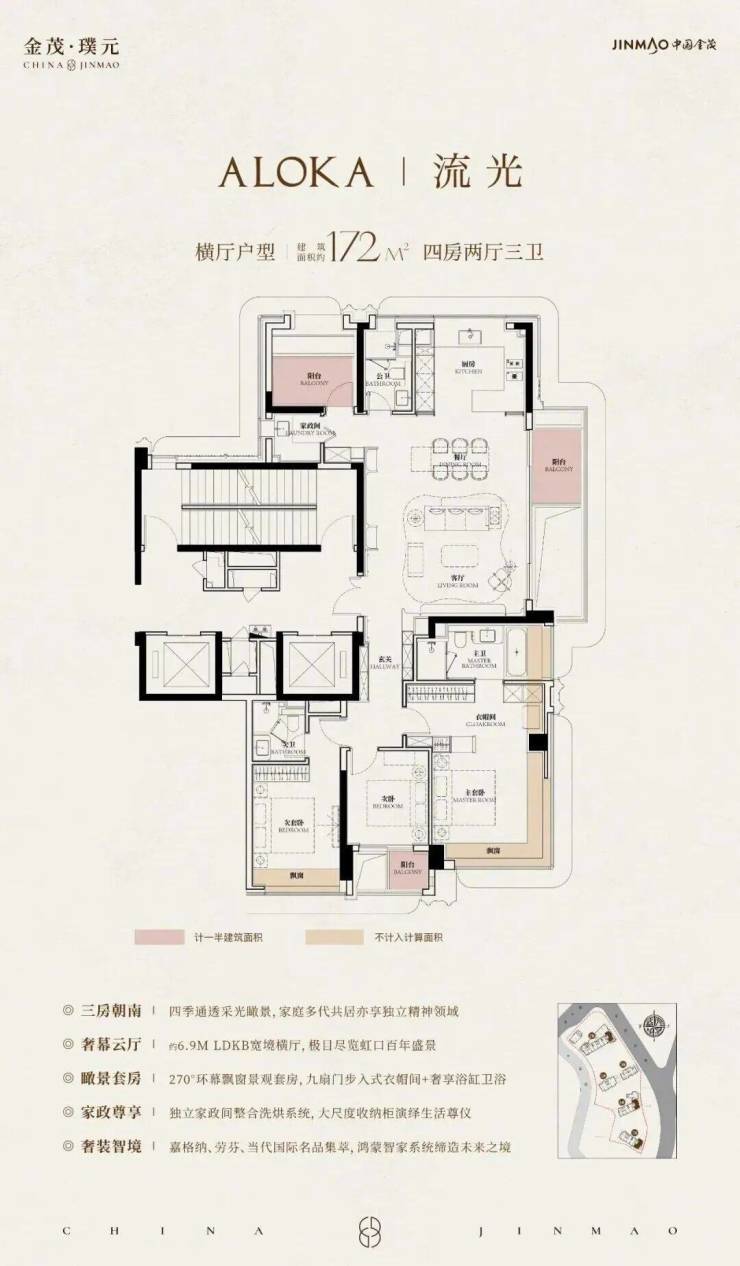 169-172㎡ 4 房 2 厅 3 卫:四开间朝南、7.2 米横厅、双套房、270° 飘窗;总价 2415-3194 万