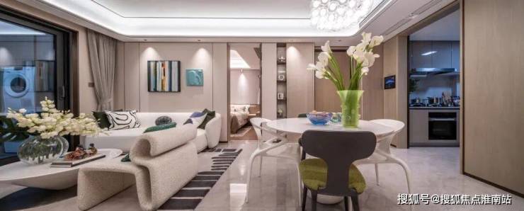 建面约104㎡2+1户型,是甜蜜二人世界到温馨三口之家的理想成长型居所, 约5米阔尺横厅VS「+1」空间的双重设计,轻松放下3米长的大转角沙发、大茶几,并且还能摆下1.8米长的餐桌和六把餐椅,空间依然游刃有余,还能延伸出更多亲子与趣味空间。