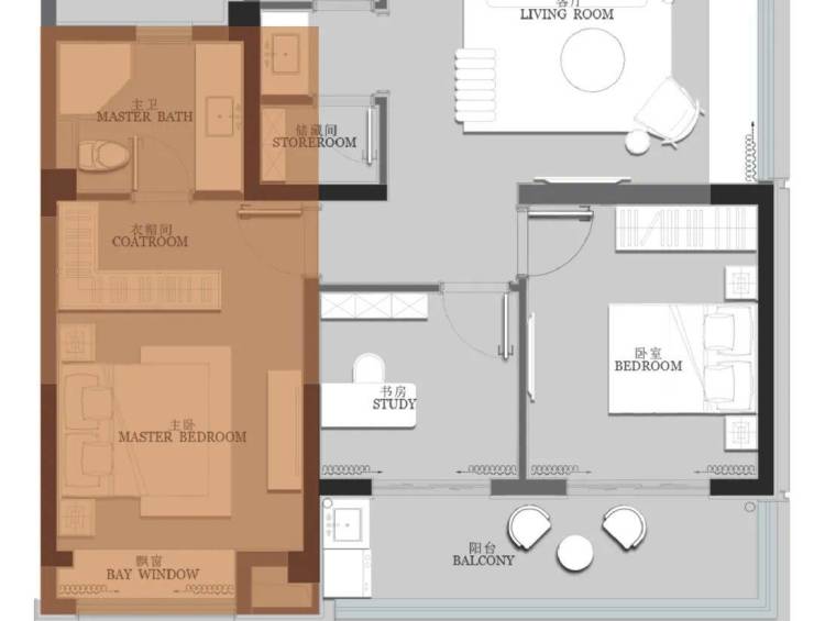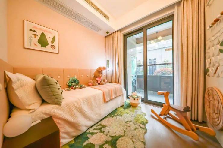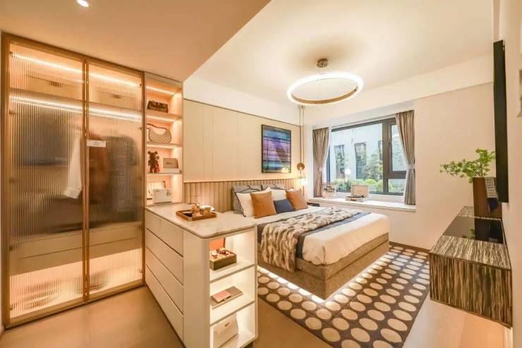 当主卧以外的空间被家人占用时,主人往往退居主卧享受其私人空间。酒店式套房空间,将南向飘窗纳入室内,整体面积约24㎡的私人场域,可以轻松放置一个独立的L型转角衣柜收纳空间,衣物可以按照季节、材质、颜色等维度进行分类,充分彰显主人品味,还可打造多功能化妆台+衣柜+MINI吧