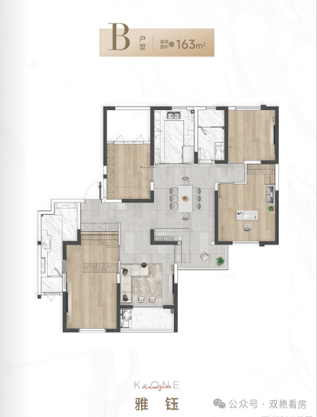 在售户型面积:建面约163㎡3房2厅2卫,分为艺术东方风格A户型与意式优雅风格B户型;另有建面约73㎡+90㎡的双钥匙双开门双户设计(未明确是否在售)