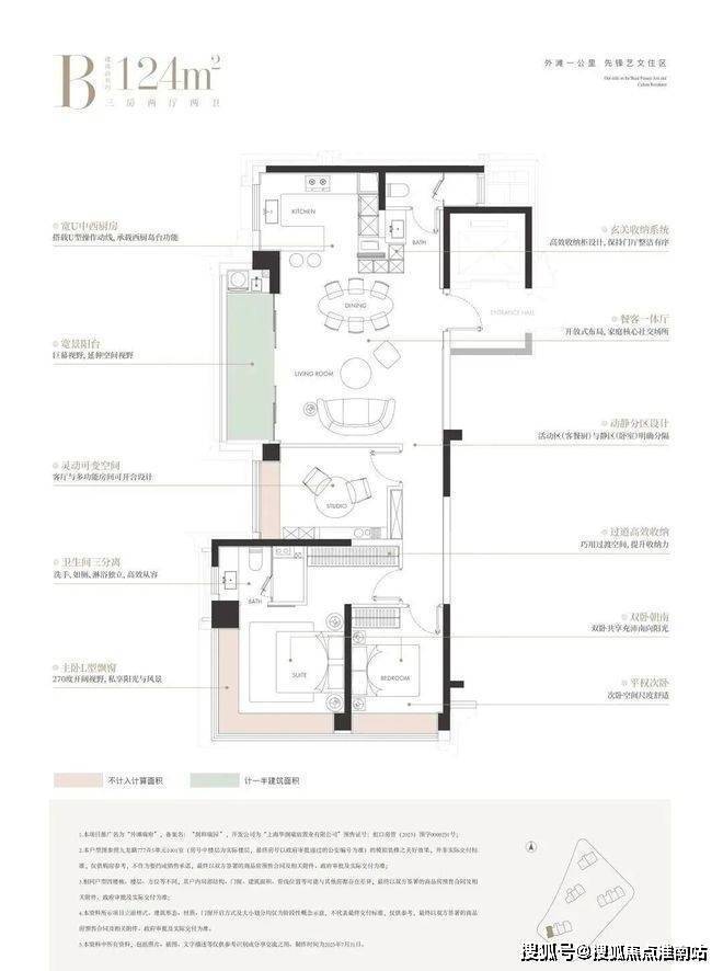 建面约124㎡的边厅“全景舱”户型,是外滩板块极致稀缺的臻品。它以三房布局满足主流家庭需求,更以无遮挡的视野与巨幕般的边厅落地窗,将城市天际线化为私藏画卷。主卧270°L型飘窗,让阳光与风景成为生活的主角。