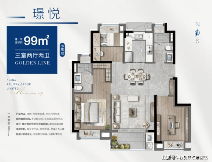 约89㎡的建面即能实现3房功能性还有2卫,主卧实现套房配置,放眼全市性价比都分外突出!格局上做到了三开间朝南,采光效果佳,客餐厨一体化减少动线,对室内面积极致利用!