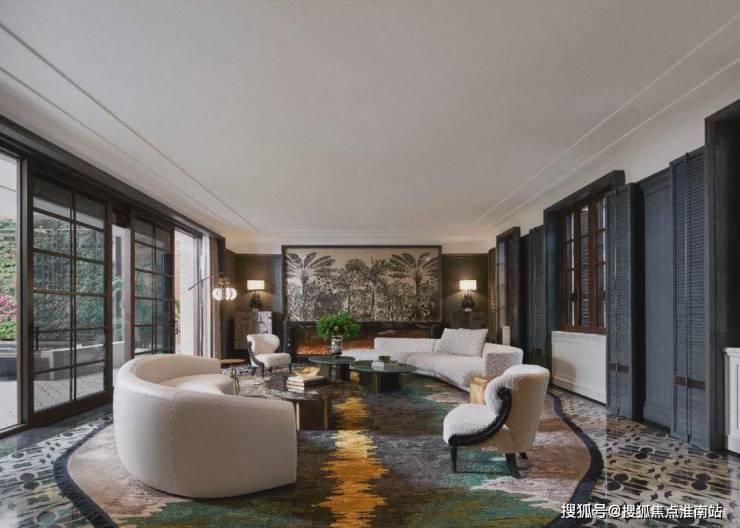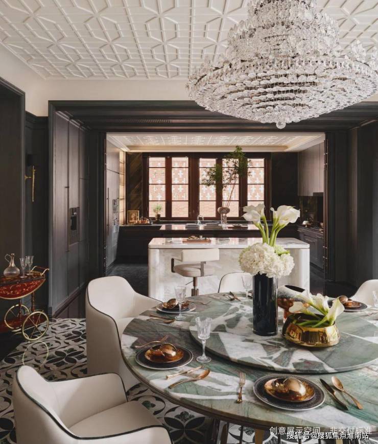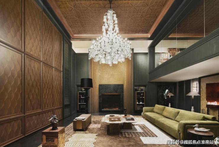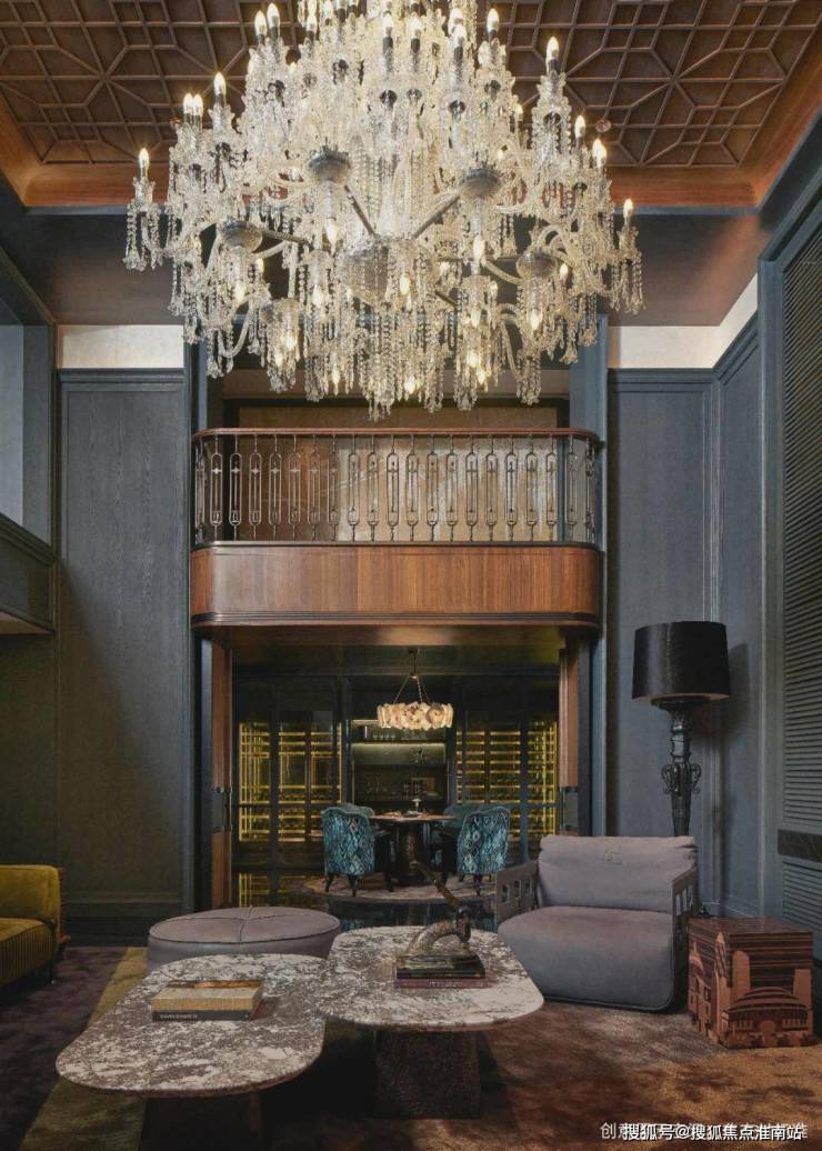移步下楼,高约5.3m米的挑空客厅(层高约5.6米),四壁深色木饰面与液态金属,从天花板倾泻而下的水晶灯,灯光与目光汇聚范思哲黑石材壁炉前的坐席,营造如议院一般的空间感受,轻描淡写的话语,也掷地有声。