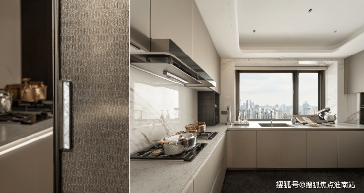 厨房内 竹纹夹丝玻璃门威乃达坡璃烤漆橱柜、与 卡拉拉金大岩板台面相融,同时 嘉格纳十件套满足每一种味蕾的偏好,厨房内,灶台/油烟机/洗机/冰箱(独立分体设计)五件套;向外, 嘉格纳咖啡机/暖碟机/酒柜/烤箱/蒸箱等西厨五件套配置,构筑中西共融的烹饪场域。