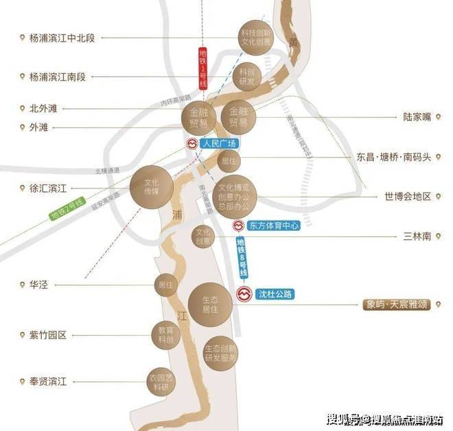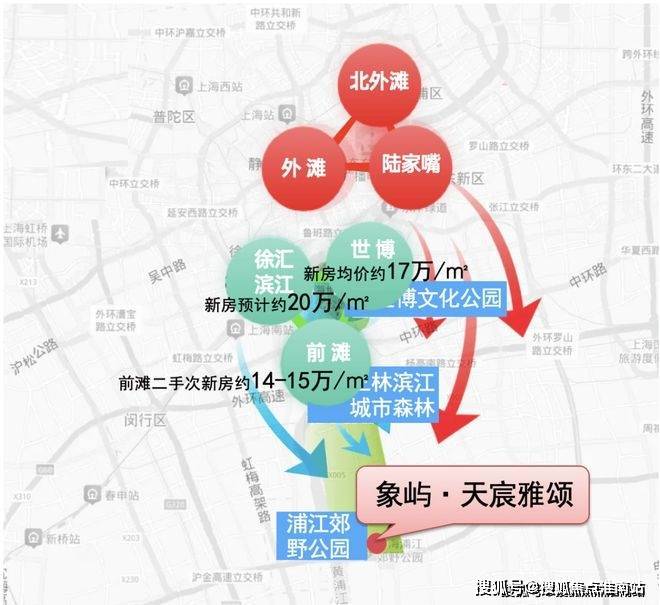 从上图可见,这两个滨江黄金三角的商业、产业、生态资源就在闵行浦江的正上方。但其房价早已是高攀不起,世博17万/㎡、徐滨冲20万/㎡,前滩二手房价已达14-15万/㎡(数据来源:链家网)!对比之下,仅6站地铁距离的浦江板块,显然性价比更高,未来潜力巨大。而且象屿·天宸雅颂占据黄浦江中上游生态链的黄金中轴,前景可期!