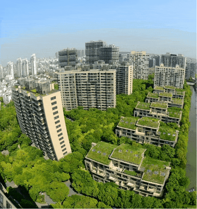 但在一次一次的颠覆中,最初小区内的硬地坪、喷泉、走廊全部敲掉,河流水景填实,全部种上11000棵成年香樟树,自造12万方森林海。