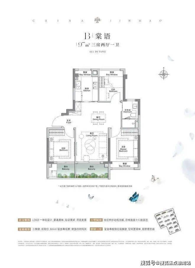 建面约97㎡3房2厅1卫,户型三开间朝南、再加上“3个飘窗+双面阳台系统”,不管是采光、视野、通风、私密性,还是实用性都十分出色。