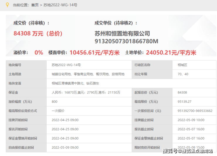 和畅雅苑,即,苏地2022-WG-14号地块项目,位于相城区渭塘镇渭中路北、钻石路东,是2022年5月9日,和恒置地以底价84308万元竞得,成交楼面价10457元/平。