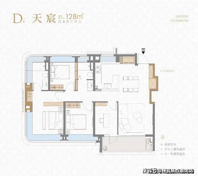 建面约107㎡3房C户型,建面约128-139㎡4房,全部是这样的设计!两个4房户型,厨房内还有飘窗空间