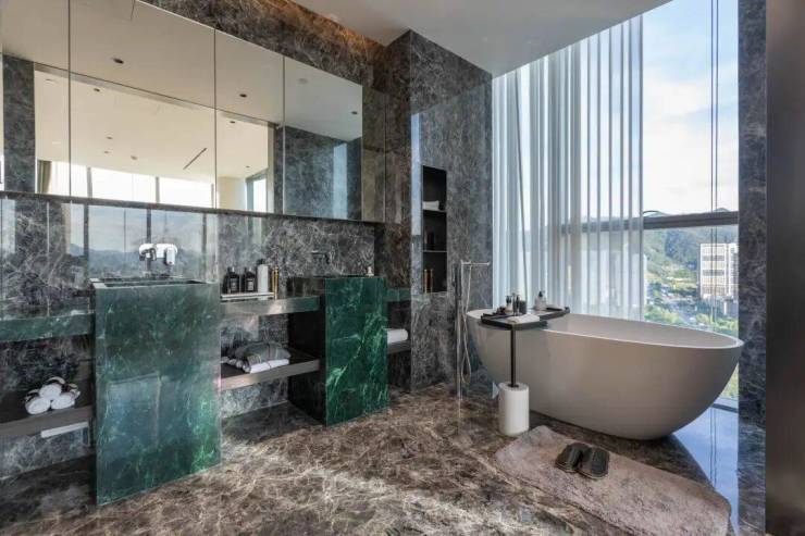 值得一提的是,卫生间台盆不满足于买个成品,而是用奢石掏了2个台盆,跟亿元豪宅广州鹏瑞1号是同款,极富设计感。全屋的木饰面也很有特色,是锯齿纹天然黑胡桃小山纹,层次丰富、静谧雅致,致敬的是曼谷丽思卡尔顿酒店。丝绸流线型的超白玻外立面,温润的消融在森林里。