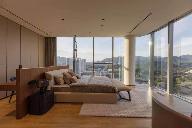 在这样的森林中,自然是用约17米面宽270度视野把景观最大化请进来。双入户设计,一梯一户设计,建面约70m²的大客厅,它与松涛阵阵、草长莺飞融为一体,无论是浅聊会客还是招呼亲朋,对酒当歌,在这儿都可以轻松把握、随意发挥。难怪有业主说,因为一扇窗,买了一套房。