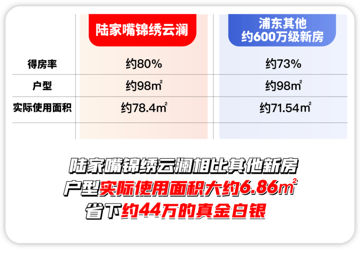 也就是说,陆家嘴锦绣云澜室内的各个空间,其实都要比同级别新房更大。这多出来了约6.86㎡房源,直接为业主省下了约44万的真金白银。