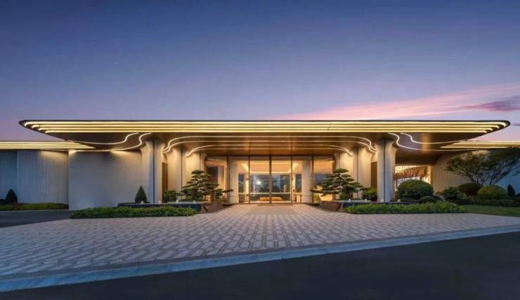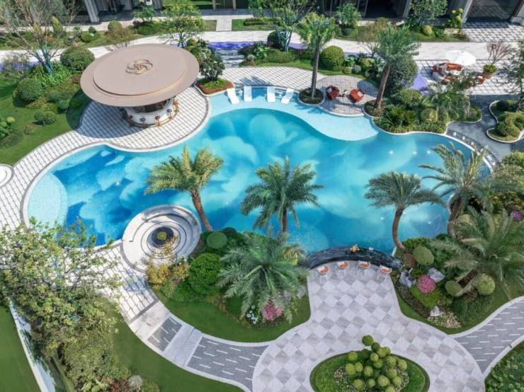门前两棵罗汉松;园区内的中央园林围绕新型蓝宝石戏水池打造,营造澜韵迎宾、松鸣涧语、鸣泉叠韵、鸣芳拾趣、鸣香径幽等九境空间。