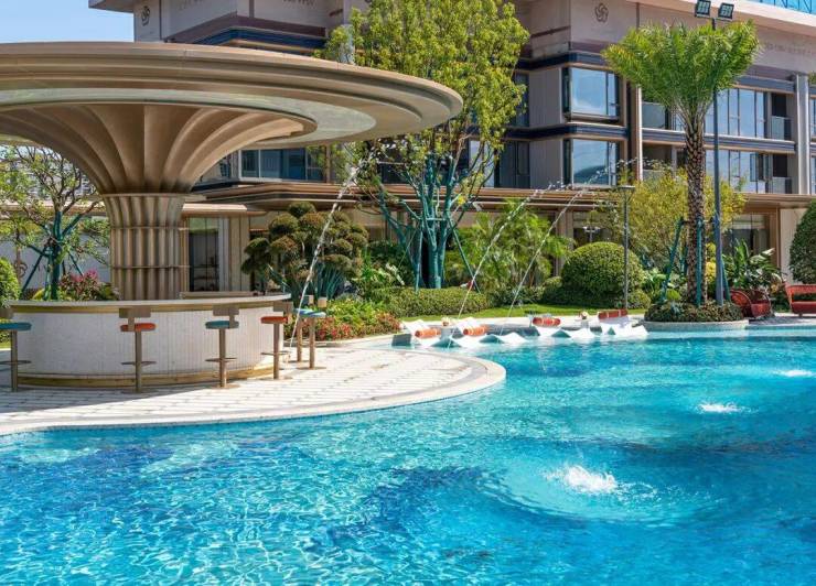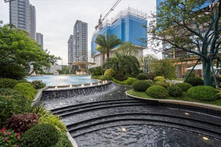 小区的园林景观一如既往延续了滨江的水准,中心区域设置了自然度假式的景观水池,配合棕榈等热带植物,结合着开放式酒廊和下沉卡座,整体度假氛围很不错。未来园区内还会设置童玩区等设施。