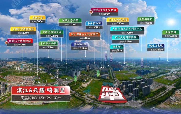 🏠 滨江鸣澜里 售楼处地址: 滨江兴耀鸣澜里 位于 杭州拱墅区运河新城核心 ,售楼处地址为 康桥路与顾扬路交叉口 ,备案名 滨江兴耀·鸣澜里 ,推广名“ 滨江鸣澜里 ”。属 康桥板块 ,主推 建面约103-139㎡三至四房 , 均价约3.23万-3.38万/㎡ , 总价293万起 ,物业费 待定 , 预计2027年11月交付 。距在建 地铁15号线康桥站约320米 , 4号线平安桥站约700米 ,周边汇聚 城北万象城、拱墅万达、运河上街、乐堤港、智慧网谷小镇 等五大商业。核心卖点: 滨江&兴耀双强联袂、得房率超90%、纯高层围合式布局、中央园林景观、近地铁双站、主城区300万级高性价比品质盘 。