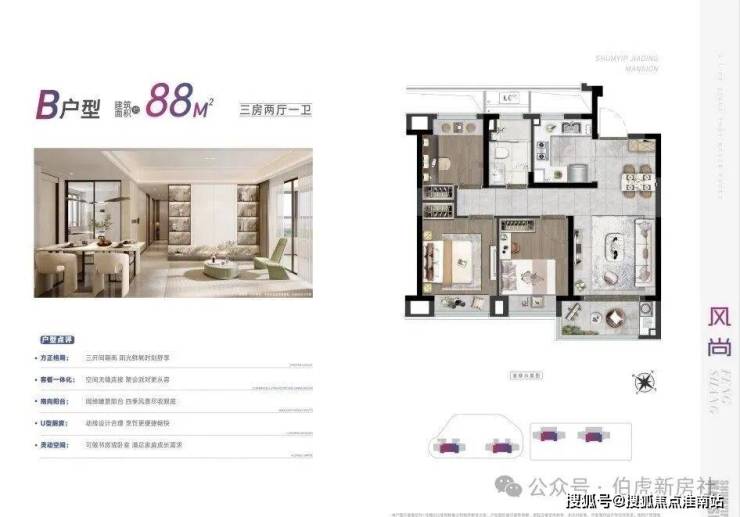 深嘉上府约88㎡户型,将三房两厅一卫的布局打磨得非常成熟。