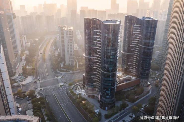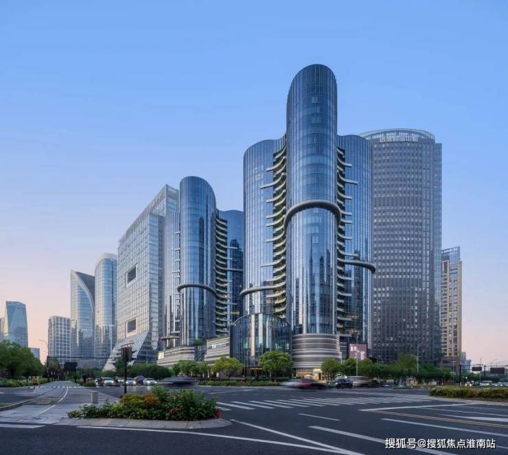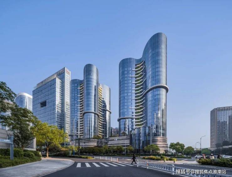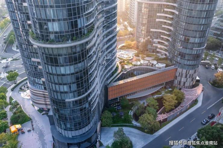 维持建筑原有结构的弧线美感,并将其由鸟瞰视角的美延续至人视可见的街景。建筑形体如两座耸立秀美的茶山,散发杭州特有的气质。山形建筑之下,裙楼屋顶被整体设计为开放式花园,使建筑、绿植、公共景观相互串联,成为隐藏在城市中的桃源绿谷,为使用者提供独特的空间体验。