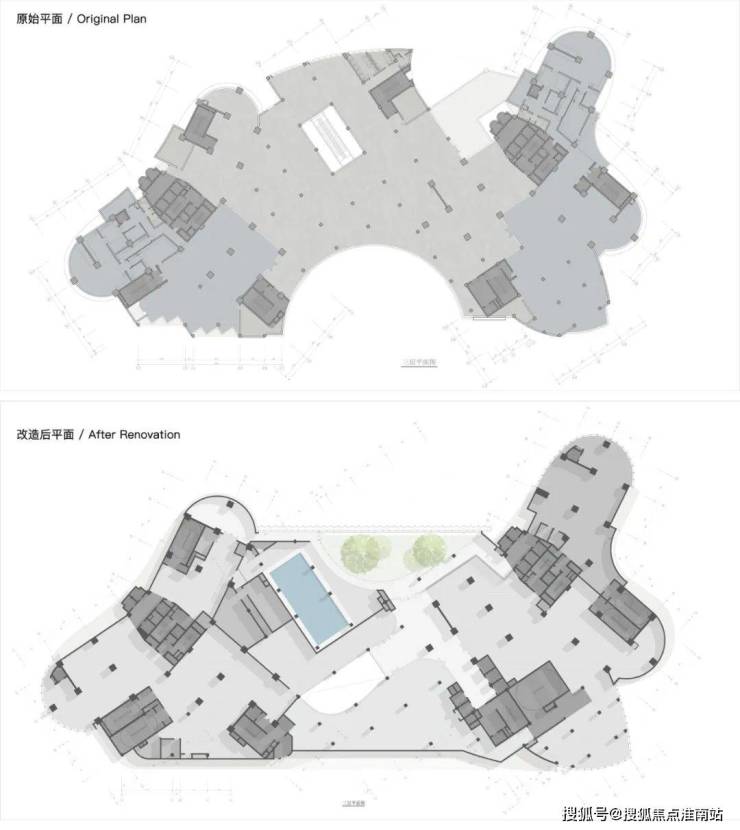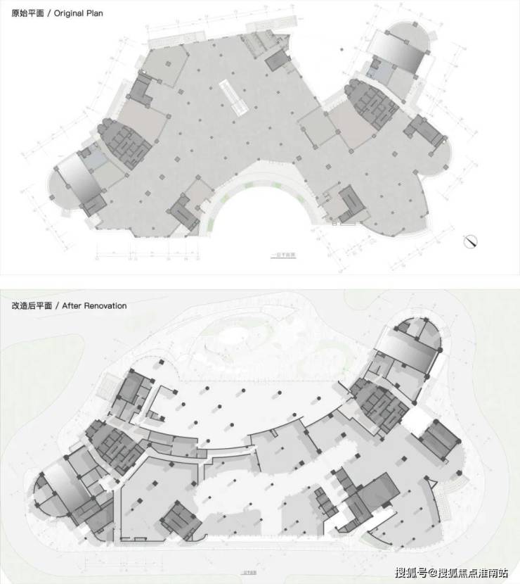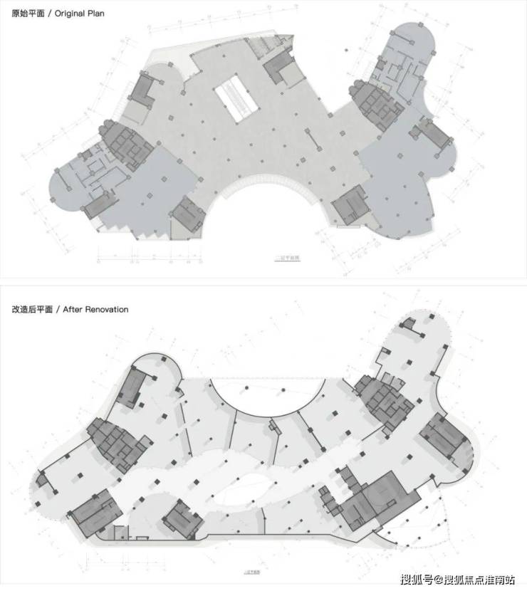 原建筑为纯办公属性,故原布局在南侧设置有内凹的集合广场,改造则引入了全新的使用需求——社区商业。新功能为总图布局提出了改造需求,商业需要开阔的沿街展示面和外摆空间,并面向主城市界面。而办公区则需要相对私密的空间流线和便捷的车库出入,同时业主还希望为其打造一个独立私密花园以区别于周边的普通写字楼。在和甲方/施工图院/结构工程师多次交流后,设计采用“腾龙换鸟”的策略,沿塔楼主体找结构梁,拆除北侧突出裙楼,将折损的面积全部补回南侧,填平内凹广场。