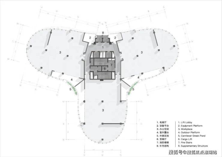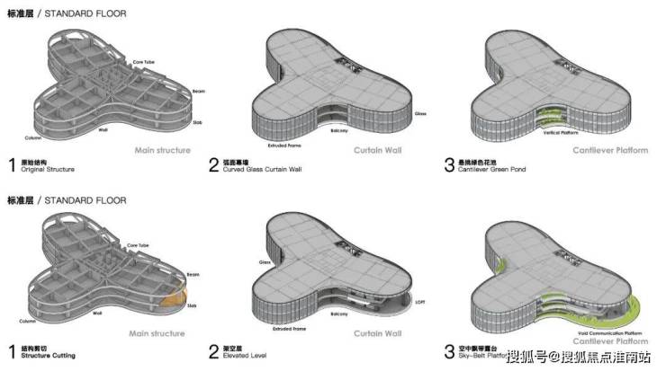 审查原始图纸时,我们发现塔楼原有设备平台丑陋的出挑于主干道方向,且受制于《城市规划条例》的变更,又无法拆除或并入计容空间内。如果藏不住,那就让它show出来,其也成为空中花园的结构雏形,绿化点缀于轮廓弧度转折点,打断过于冗长的玻璃幕墙,同时掩盖了城市的喧嚣,创造出和平宁静的空间氛围。