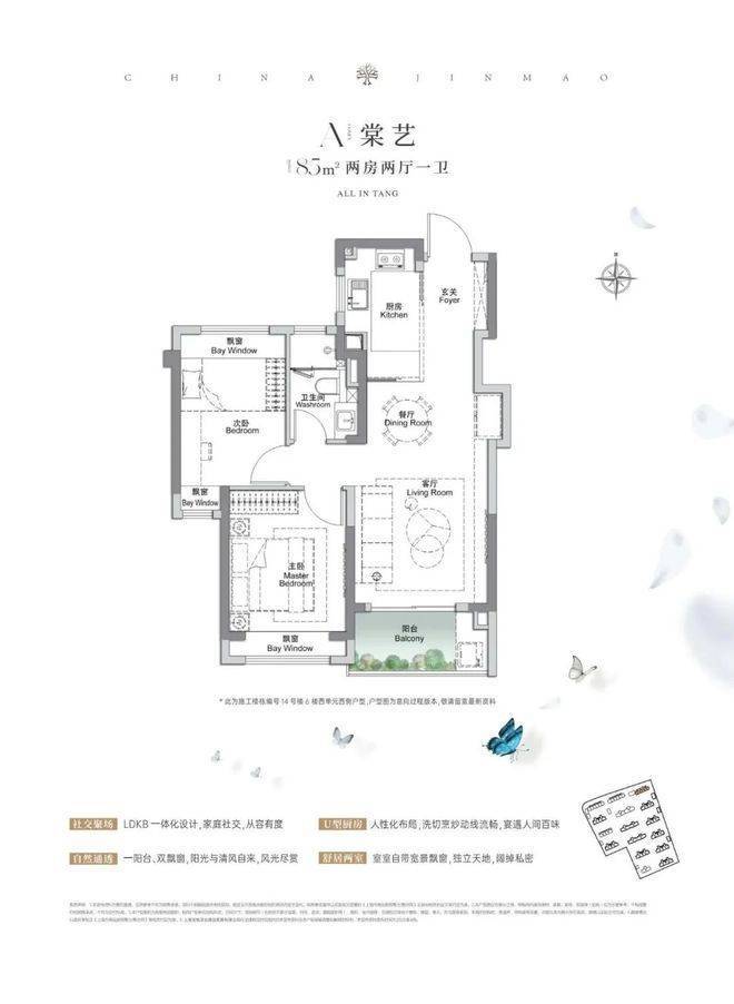 上海宝山金茂棠前售楼处电话:400-8818-994(开发商统一认证)建面约85㎡2房2厅1卫,做到了双开间朝南+3个飘窗+LDKB一体化设计,附加空间非常多。