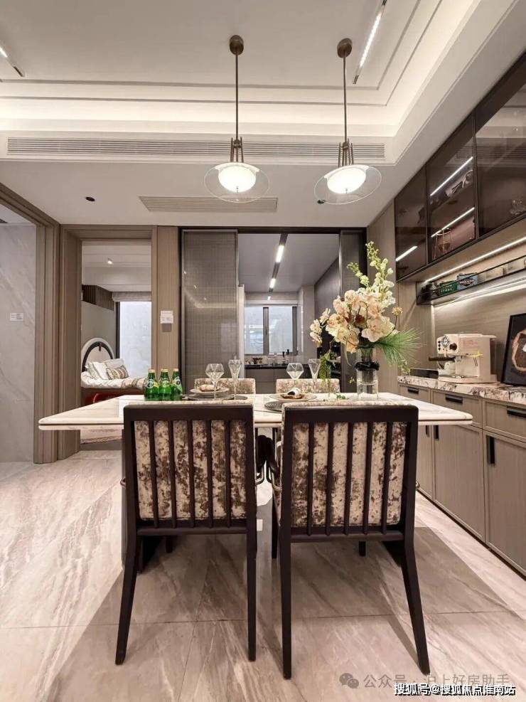餐厅区域放置一个餐边柜,同样选用了雪山飞狐奢石做透光台面设计,餐边柜在收纳储物方面具有显著作用。