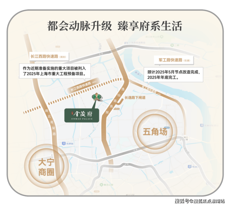 另一方面,军工路快速路新建工程预计今年年内完工(来源:上海发布),意味中环北抬今年将迈出重要一步,第二步长江西路快速路已被列入2025年上海市重大工程清单,预计即将开工——届时,江湾金茂府就将从“中环旁”升级为“中环内”!