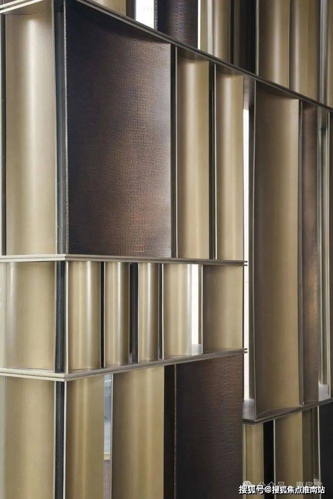 顶部定制发光云石亚克力与圆弧形的古铜色铝板交相辉映,8个西班牙宫殿沉香米黄石柱提升了尊崇感,漫步其间,揽风入怀,树影斑驳映入眼帘,水声潺潺入耳,归家的轻松感油然而生,笔者随手一拍,都非常的出圈。