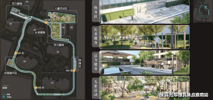 五大运动活力系统:热身区、定制主题儿童活动区、老年健身区、活力健身区和休憩缓冲区,并由约400M跑道串联