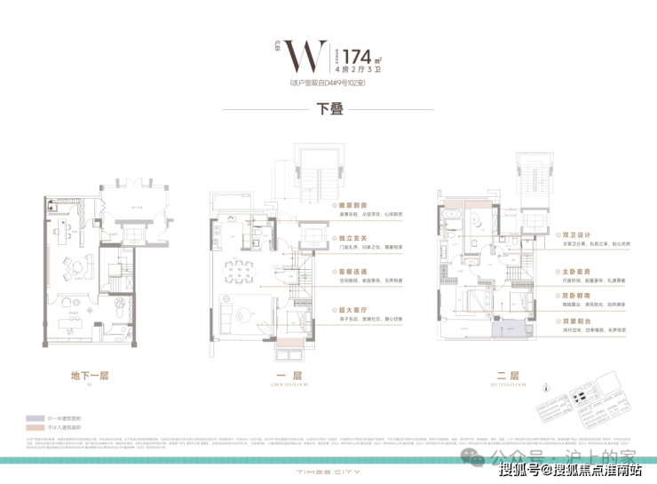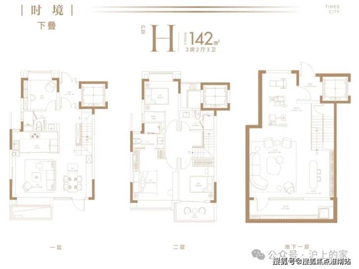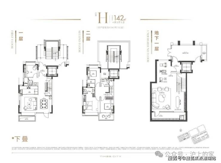 以建面约142㎡下叠为例,地上两层、地下一层阔绰空间,动静科学布局,全面考量三代同堂与二胎家庭的居住空间需求,以人性化质感空间演绎舒奢生活。
