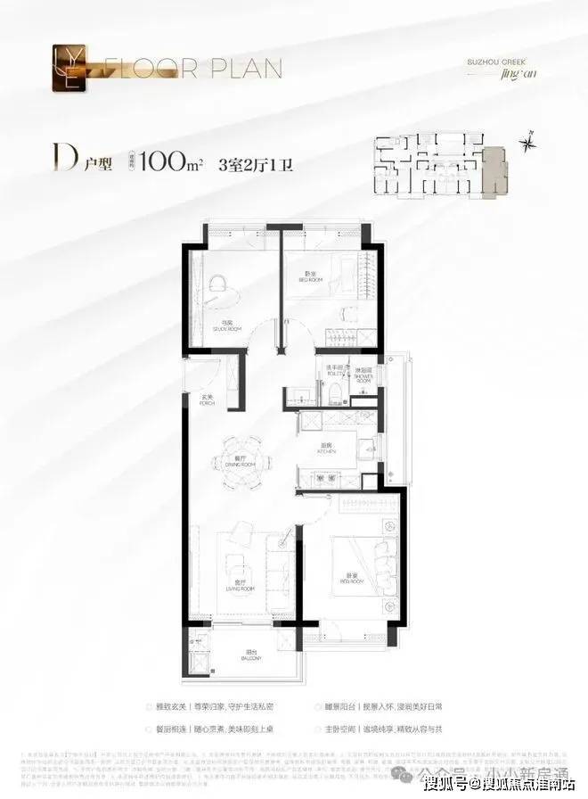 建筑面积约100㎡3房D户型:南北通透的设计让该户型拥有更加优秀的通风效果。而且这个户型做到了全卧飘窗(3个飘窗)+南向瞰景大阳台,丰富的灵动空间提升了实得面积!