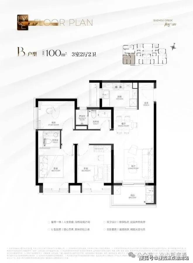 建筑面积约100㎡3房B&C户型:3房功能性符合市场主流需求,三开间朝南的布局保证充足光照。动静分离的设计让安静与活力同在。主卧套房设计,舒适度和私密性双爆表!
