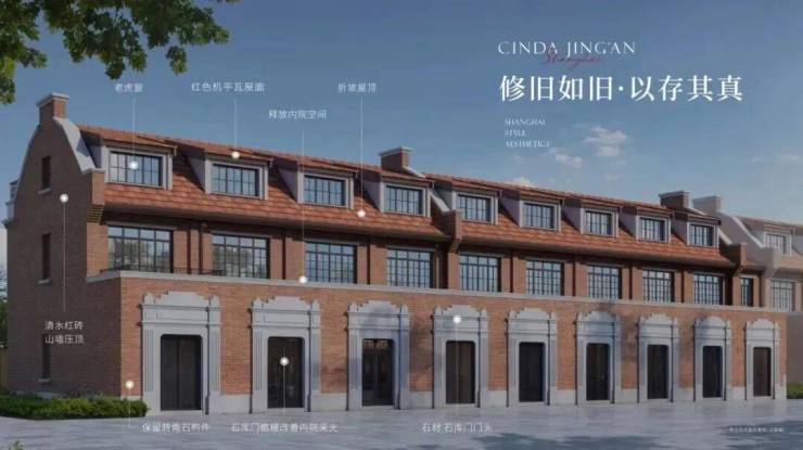 项目外立面并非简单模仿传统样式,而是通过对孟莎式屋顶、清水红砖外墙、传统石库门门头、老虎窗等元素的保留与转译,实现海派建筑语汇的当代延续。