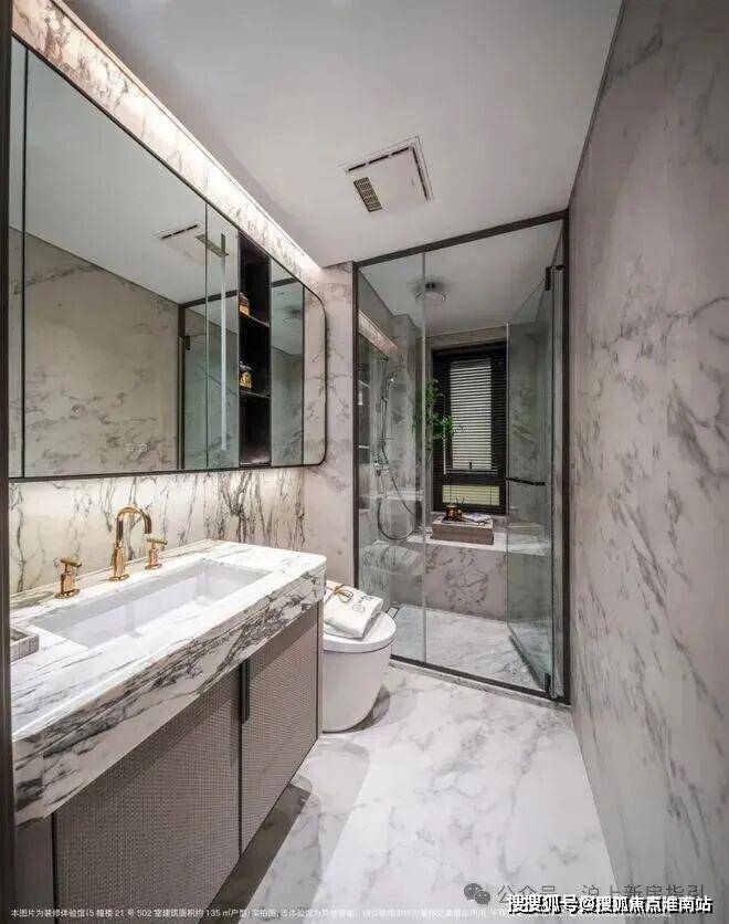 卫生间墙面采用大面积岩板,台盆柜处定制镀金龙头;另外超大镜面柜内配置了充电口,方便剃须刀、电动牙刷等工具收纳。招商臻境售楼处电话4008567004☑️☑️