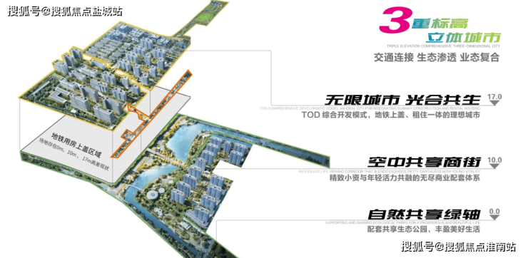 二度标高10m:配有生活服务配套,商业、公园、办公。1万㎡精致生活配套、盖上商业文化、体育文化、养老医疗、行政管理健康四轴。