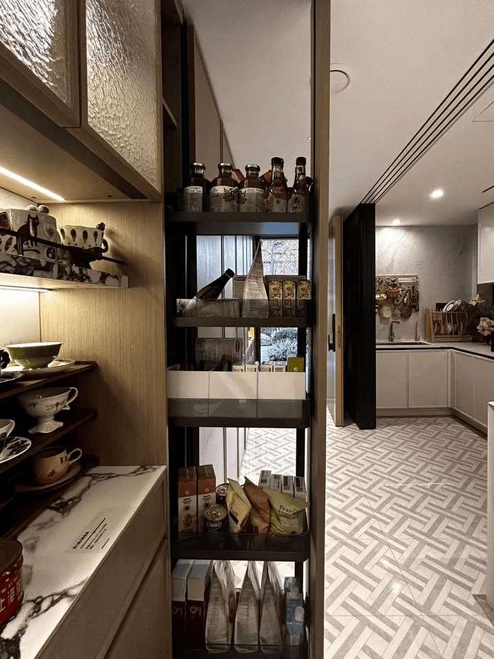 可抽拉的零食柜、厨房抽屉式碗碟拉篮、包括卫浴的收纳墙,于细节之处见真章。