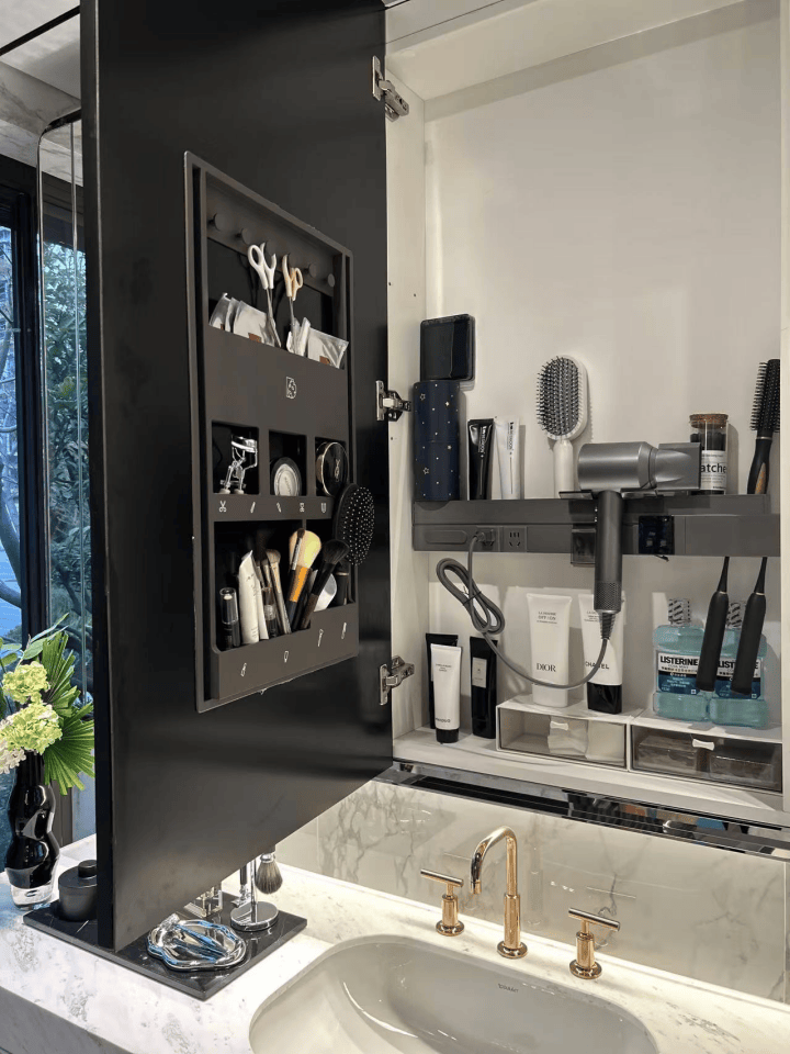 主卫的镜柜,也做双面收纳设计。主卫延伸出来的创新飘窗,可以在上面摆放各种日常用品。