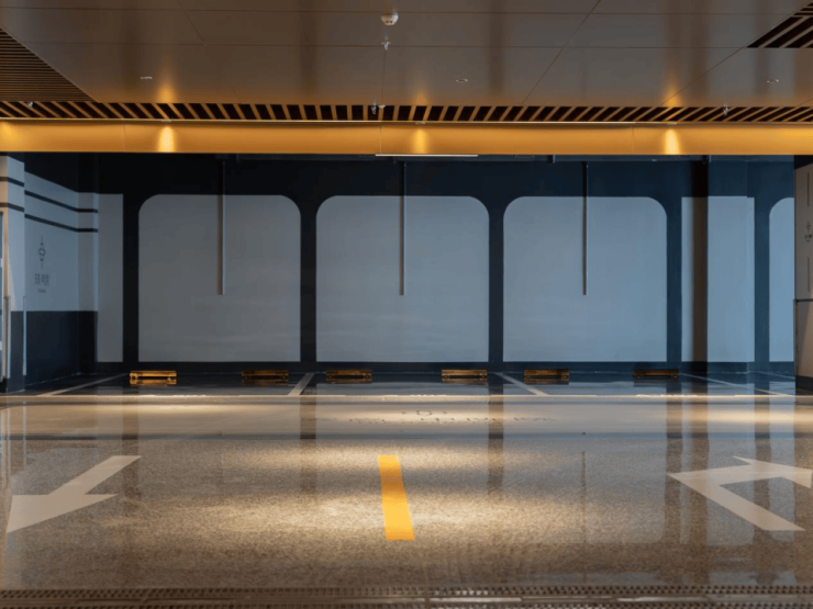 地库内部的营造也超越常规:行车道以成本更高的钢纤维混凝土浇筑出磐石般的基底,再覆以精磨石面,呈现出温润如墨玉的匀质光泽。这组搭配对比普通水泥地面更坚固耐用,对比环氧地坪更耐磨,抗渗透能力极强。