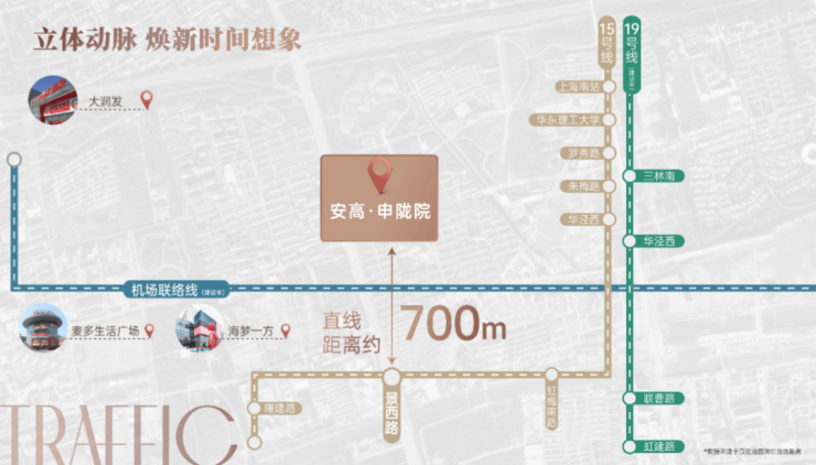 周边还设有时速达160公里的机场联络线华泾站,可极大的缩短上海虹桥、浦东两座机场之间的距离,实现空铁直通;未来还会新增一条能与19号线换乘的23号线(在建中),将设华泾路站连通徐汇滨江,直抵上海体育场。