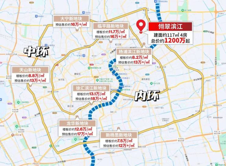 中心城区的土拍价格直线上升, 虹口临平路地块的拍出楼板价约11.7万/㎡、徐汇滨江两幅地块楼板价约12.6-13.1万/㎡...