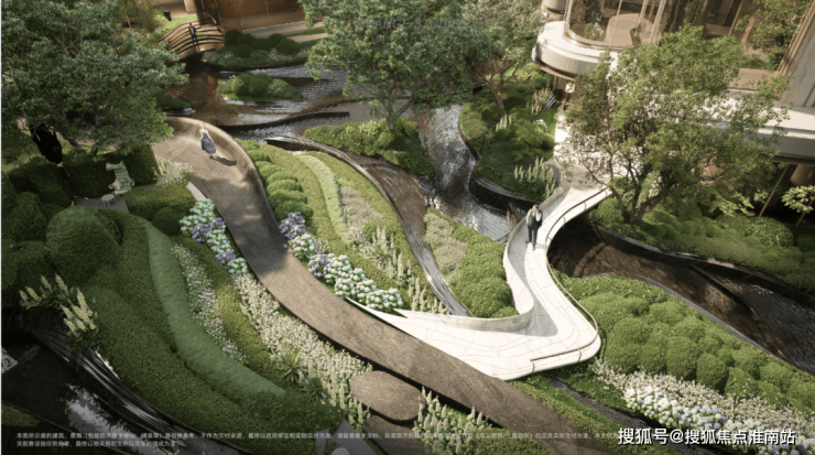 借由全域抬板的高度差,形成罕见垂直落差。项目依托这一独特地形,打造多层立体景观体系。让业主即使身处市中心,也能享受到推窗被多维度绿意包围的奢侈。